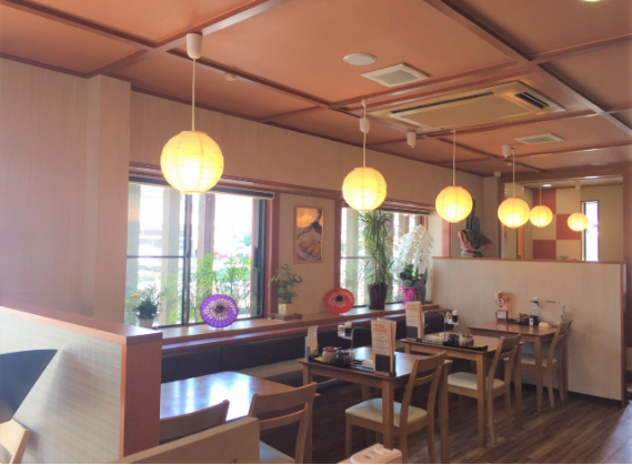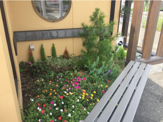 店内には扇子や和傘を配置し、和を意識したお店作りをしています。また、お店の花壇や、店内の目に付くところには植物を置いてお客様にリラックス出来るように工夫しています。